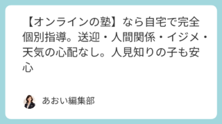 【オンラインの塾】なら自宅で完全個別指導。送迎・人間関係・イジメ・天気の心配なし。人見知りの子も安心「オンライン 塾」と検索している保護者の方は、きっとお子さまの学習環境について真剣に考えているはずです。近くに塾がない、送り迎えが難しい、部...